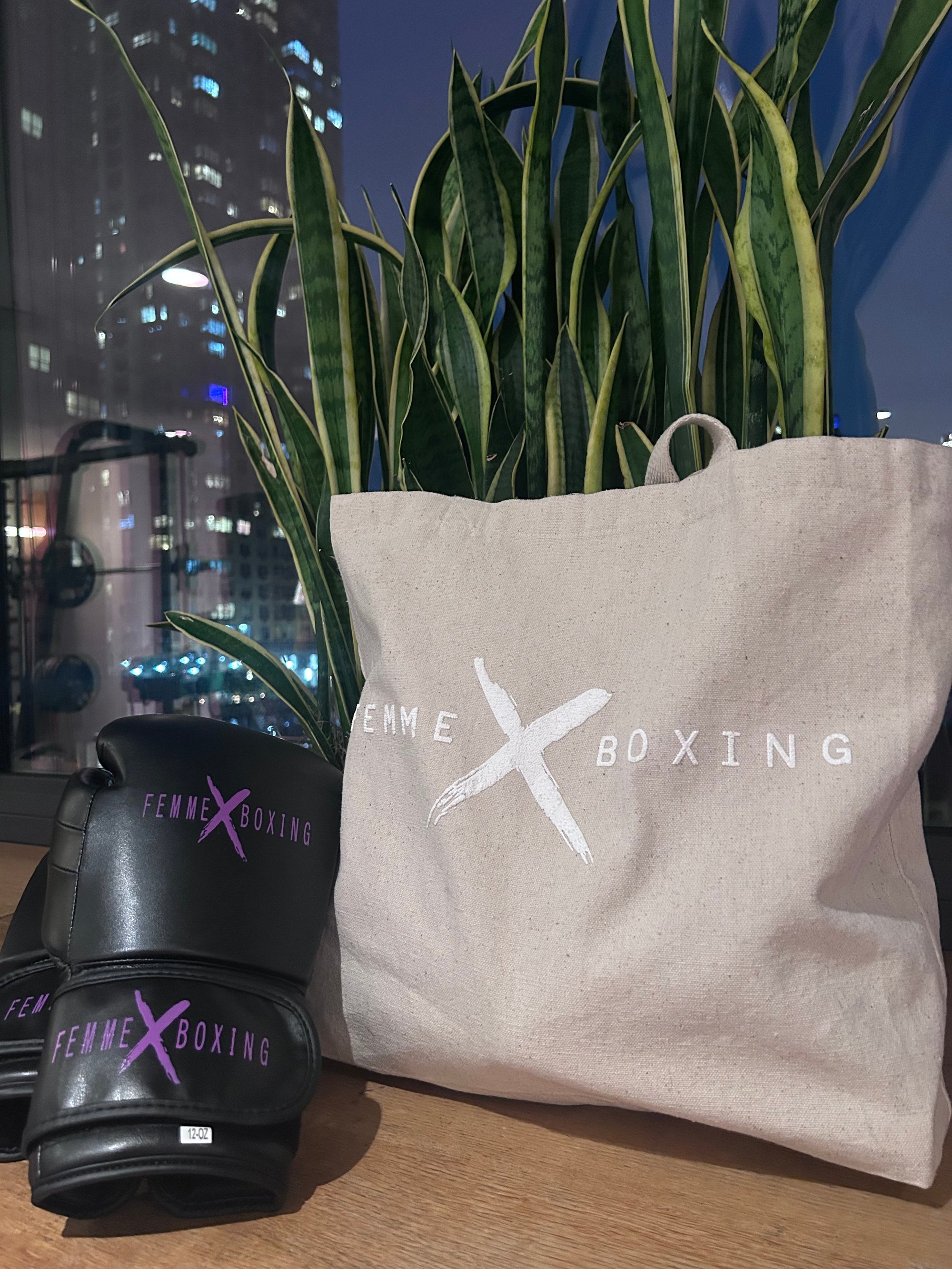 Canvas totes come in colors black and white and are big enough to double as a gym bag. Large bags can comfortably fit a pair of gloves, a tee, a jumprope, your water bottle. Medium $18 Large $25